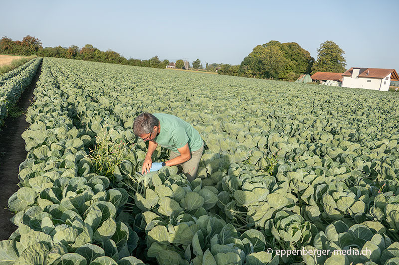 Es geht weiter auf der Fahrt zu einem Rosenkohlfeld, einem besonderen Problemkind aus Sicht des Pflanzenschutzes. «Mit seiner langen Standzeit ist er über kurz oder lang praktisch jedem Schädling ausgesetzt», erklärt Martin Keller. Mit dem andauernden Rückzug von Wirkstoffen sei es inzwischen sehr schwierig, solche Kulturen überhaupt noch sauber durchzubringen. Beim Rosenkohl steht die Weisse Fliege besonders im Fokus. Martin Keller stülpt sich einen Gummihandschuh über die linke Hand. «Wir wissen jeweils nicht, ob die Kultur gerade behandelt worden ist.» Er als Berater liefert vor allem Daten, Befunde und eher zurückhaltend Empfehlungen. «Das Handeln liegt in den Händen des Betriebsleiters oder der Betriebsleiterin.» In diesem Fall hat dieser offenbar vieles richtig gemacht, weisse Fliegen sind kaum vorhanden. Martin Keller stellt sowieso fest, dass der Befall tendenziell eher abnimmt. Es ist eine Beobachtung, die er aus all den Jahren auf den Gemüsefeldern mitnimmt: «Schädlinge treten in mehrjährigen Zyklen auf». In den 1990er Jahren sei beispielsweise die Kohl-Drehherzgallmücke ein riesiges Problem gewesen. Heute käme sie kaum mehr vor. Wie und weshalb es zu solchen Zyklen kommt, bleibt für ihn ein ungelöstes Rätsel.