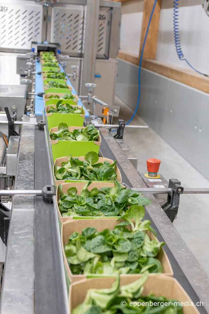 Eine spezielle Maschine packt den Nüsslisalat automatisch in Schalen für den Detailhandel ab.