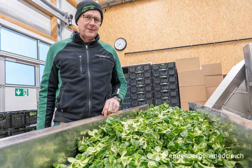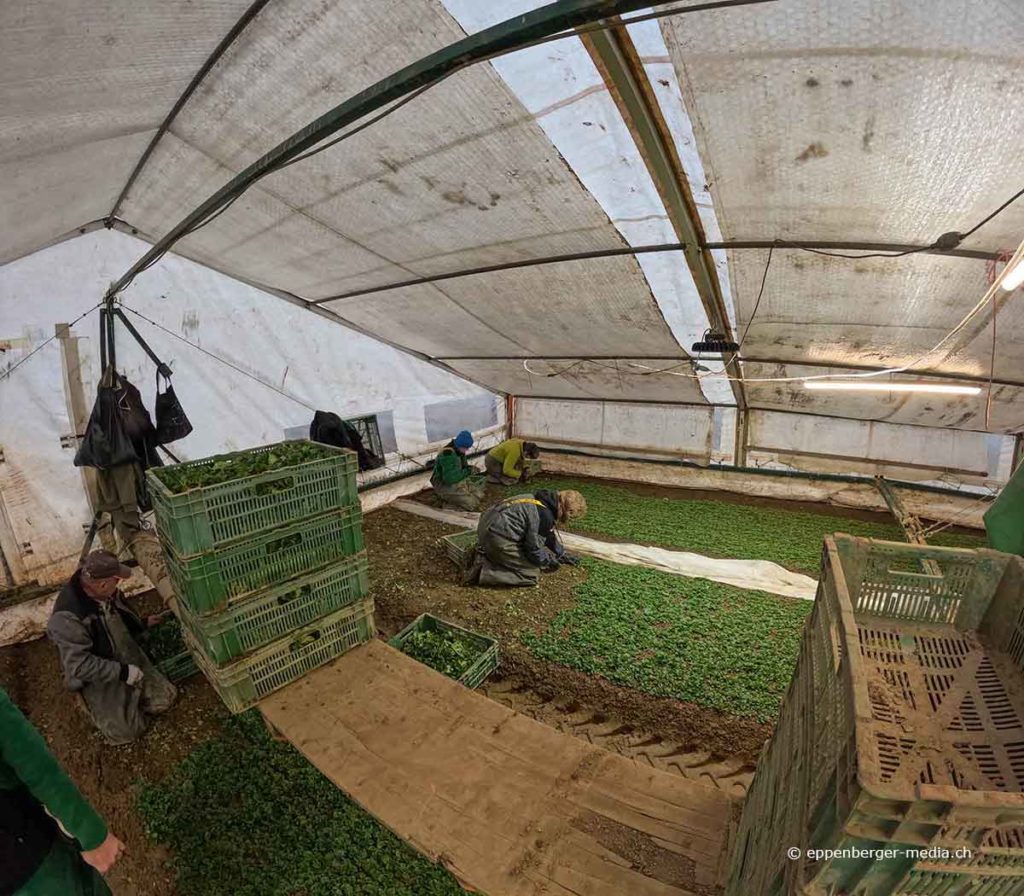 Während es viele andere Landwirtschaftsbetriebe im Winter ruhig angehen lassen, herrscht auf dem Gemüsebaubetrieb der Familie Käser Hochbetrieb. In der Packerei steht die Maschine, welche auf dem Fliessband Kartonschalen des Detailhandels mit je 105 Gramm Nüsslisalat befüllt. Vor Weihnachten stiess diese bei der Leistungskapazität erstmals an ihre Grenzen. Rund 40 Arbeiterinnen und Arbeiter, vornehmlich aus Polen und Portugal, arbeiten auch in den Wintermonaten auf dem Betrieb. Vor den Feiertagen gilt für diese eine «Feriensperre». In besonders intensiven Phasen oder bei Personalknappheit greift auch das Führungsteam um Thomas Käser mit Partnerin Doris und Sohn Roman zum Erntemesser und setzt sich in den geheizten Zelten neben die Mitarbeitenden auf die Knie. «Unsere Mitarbeitenden sollen jeden Moment spüren, wie wichtig diese Arbeit für uns ist!» Ausgehen wird ihnen diese nicht so schnell.