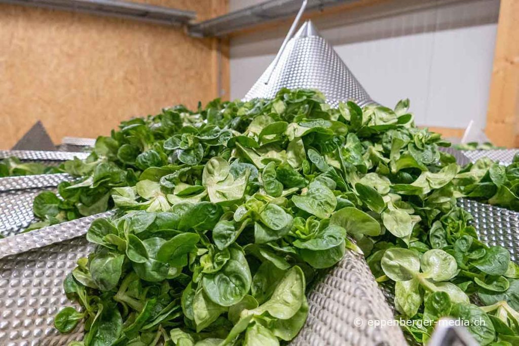 Die Kisten mit dem geernteten Nüsslisalat kommen zuerst für zwei Tage in den Kühlraum. Denn die Rosetten müssten sich erst einmal erholen, erklärt Thomas Käser. Die Ernte bedeute für den Nüsslisalat puren Stress: «Beim Auftauen fliesst der Pflanzensaft abrupt in den oberen Bereich und dann wird er mit einem scharfen Messer geschnitten.» Das alles muss die Pflanze erst einmal verkraften. Es habe sich gezeigt, dass der Nüsslisalat nach der Ruhepause besser aussehe. Gut Ding will offenbar auch hier Weile haben. Eine spezielle Waschmaschine reinigt den Nüsslisalat von Schmutz und Erdresten, welche während der Saison zu einem ansehnlichen Berg heranwachsen. Die Erde landet aber zurück auf den Feldern, womit sich der Kreislauf schliesst. «Garten-Nüssli im Freiland gewachsen» steht auf der Folie, welche die nun mit dem gewaschenen Salat gefüllte Kiste abdeckt. Beigelegt ist ein Infoflyer, welcher die Vorzüge des Produktes beschreibt. Die Präsentation ist ihm wichtig: «So geben wir unserem Nüsslisalat eine Identität und heben ihn von der Masse ab.» Die Kisten mit dem losen Nüsslisalat gehen in den Handel zur treuen Kundschaft, zu denen auch Direktvermarktungsbetriebe zählen. «Viele von ihnen starteten mit uns damals ins Abenteuer und sind Teil der Erfolgsstory», sagt Thomas Käser. Doch den Gipfel erreichte er erst vor ein paar Jahren, als ein Grossverteiler bei ihm anklopfte.