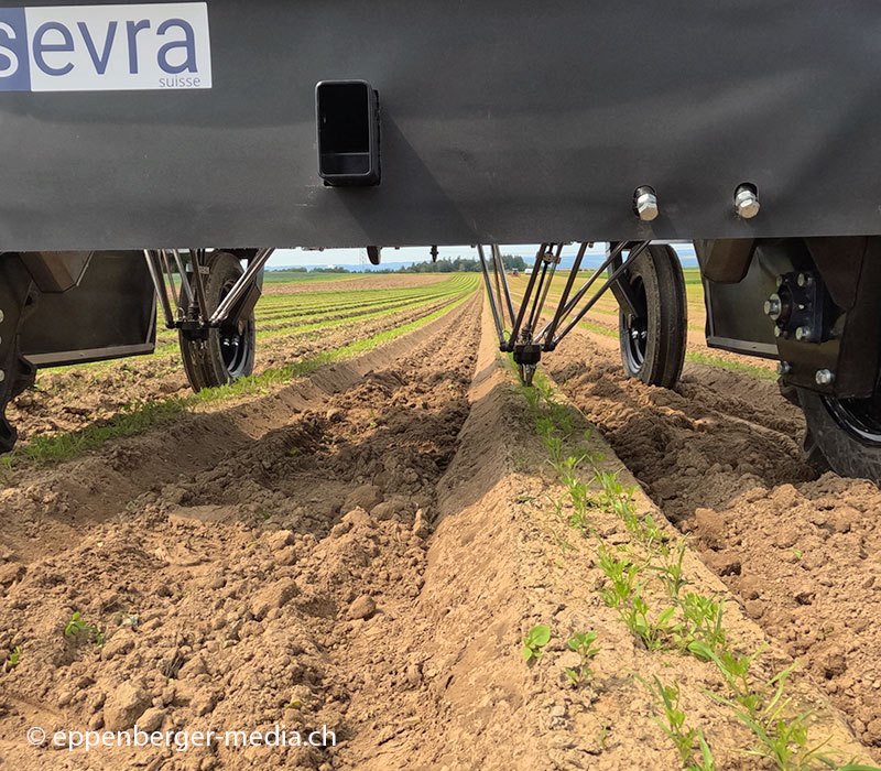 Idealerweise werde zwischen den Dämmen vorab konventionell gehackt, erklärt er. So könne sich der Maverick dann auf das Unkraut zwischen den Karotten auf einer Breite von etwa 20 Zentimetern konzentrieren. Der erste Eindruck passt, das Unkraut wird ziemlich zuverlässig entfernt. Am Ende der Reihe wechselt er die Richtung automatisch. Doch dann bleibt er stehen, vermutlich weil die Höhen der Dämme zu unterschiedlich sind. Es sind die üblichen Anfangsprobleme solcher Geräte in einem neuen Umfeld. Die Firma Sevra testet das Gerät in den nächsten Monaten in der Schweizer Umgebung aus. Offenbar sind die ersten Tests recht gut verlaufen: «Wir werden den Odd.Bot Maverick in der kommenden Anbausaison anbieten», sagt Joel Mosimann von Sevra. Der voraussichtliche Preis soll bei rund 120 000 CHF liegen.